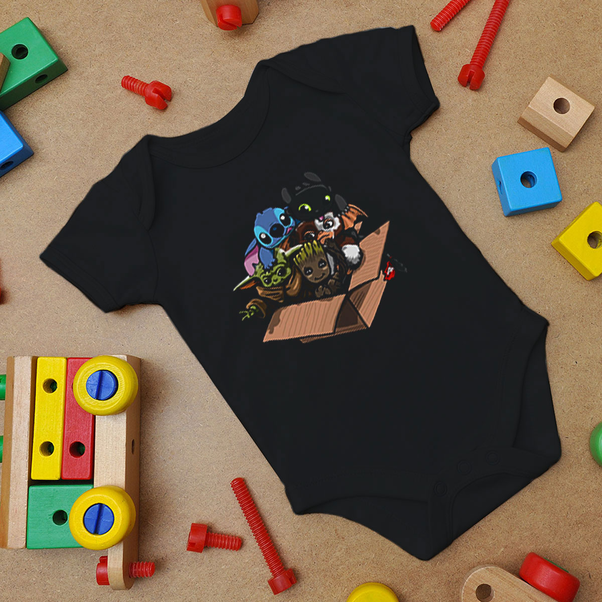Baby Yoda Baby Stitch Baby Night Fury And Baby Groot In The Box Baby Onesie Description :