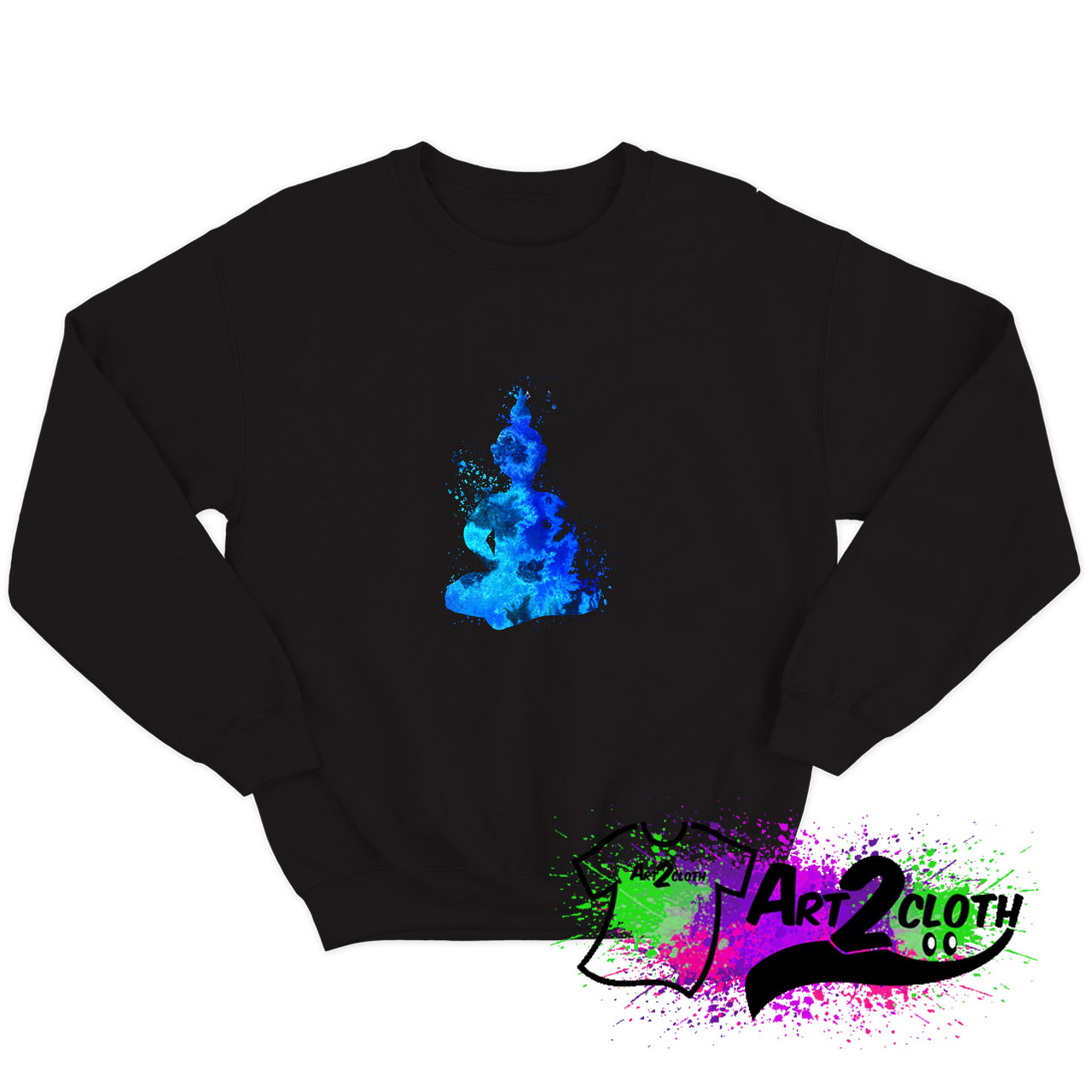 Welcome to Art2cloth.com. You’ve now found the staple Sweatshirt of your wardrobe. It’s made of thicker, heavier cotton, but it’s still soft and comfy. And the double stitching on the neckline and sleeves add more durability to what is sure to be a favorite!. Blue Buddha Silhouette Sweatshirt is everything you’ve dreamed of and more. It feels soft and lightweight, with the right amount of stretch.
